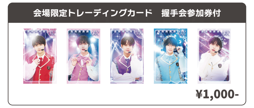 特典会の参加には、物販にて販売されるトレーディングカード(握手会参加券付き)1,000円(税込)に付随する握手券が必要となります。